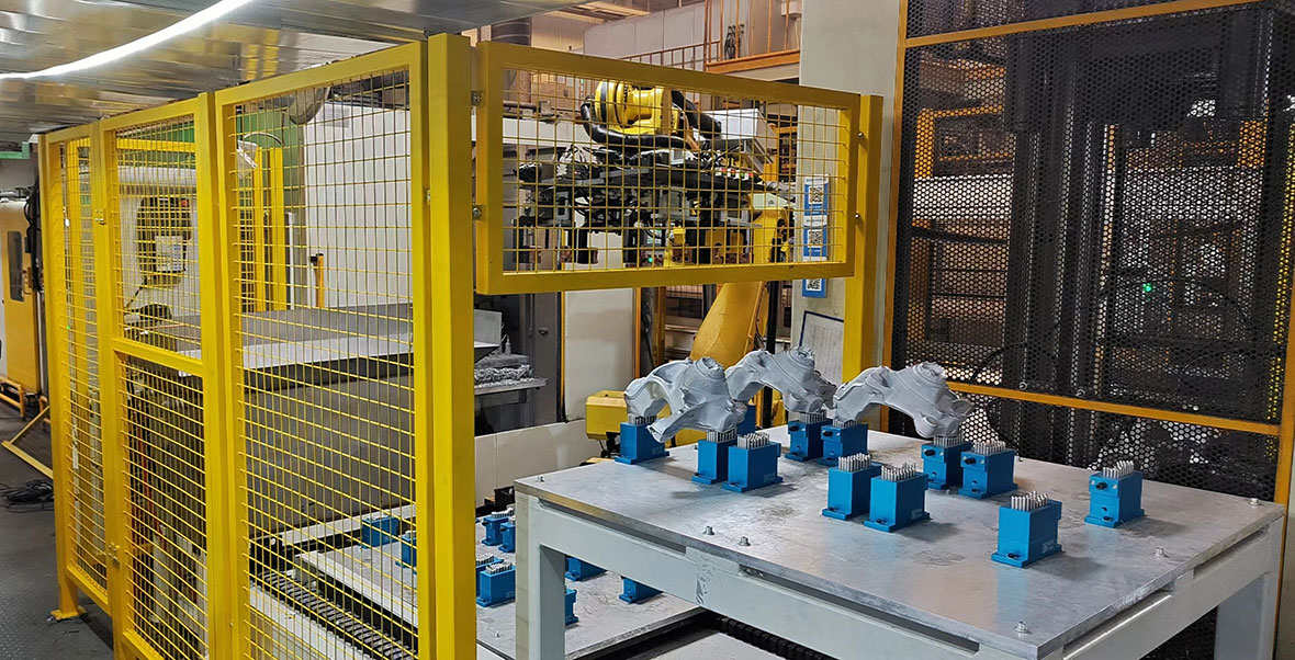 3、根據(jù)產(chǎn)品特性來制作相應(yīng)的機(jī)器人夾爪,采用雙夾爪設(shè)計,節(jié)省上下料節(jié)拍;夾指部分采用高硬度尼龍材質(zhì),有效避免工件表面磕碰,更換便捷。