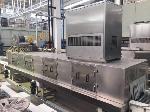 用途:用于鑄造或鍛造后的毛坯輪集中冷卻作業(yè),經(jīng)過循環(huán)水冷卻、旋轉(zhuǎn)控水、高壓風(fēng)吹水處理后,使毛坯輪轂由350℃降到50℃,同時還可以將冷卻水箱中熱水的余熱回收用于其他生產(chǎn)需求。
